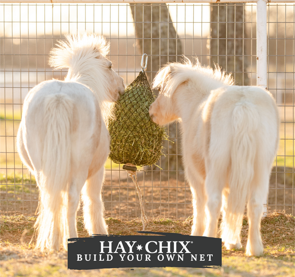 The Hay Chix® Quarter Bale Net is the smallest of our nets (fits 2 flakes of a 2-strand bale.) Formerly known as the Micro Mini.
